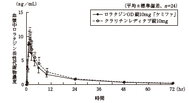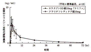 ロラタジンOD錠10mg「ケミファ」とクラリチンレディタブ錠10mgを、クロスオーバー法によりそれぞれ1錠(ロラタジンとして10mg)健康成人男性に絶食単回経口投与(水で服用及び水なしで服用)して血漿中ロラタジン活性代謝物濃度を測定し、得られた薬物動態パラメータ(AUC、Cmax)について90%信頼区間法にて統計解析を行った結果、log(0.80)~log(1.25)の範囲内であり、両剤の生物学的同等性が確認された3) 。