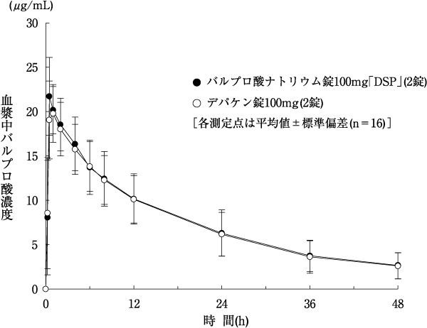 健康成人にバルプロ酸ナトリウム錠100mg「DSP」14)又はバルプロ酸ナトリウム錠200mg「DSP」15)とデパケン錠100mg又はデパケン錠200mgを、クロスオーバー法によりそれぞれバルプロ酸ナトリウムとして200mg空腹時1回経口投与して血漿中未変化体濃度を測定し、得られた薬物動態パラメータ(AUC、Cmax)について90%信頼区間法にて統計解析を行った結果、log(0.8)〜log(1.25)の範囲内であり、両剤の生物学的同等性が確認された。