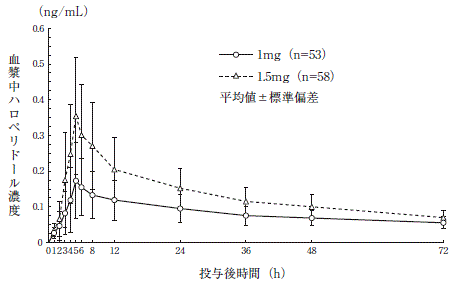 健康成人男性にハロペリドールを空腹時単回経口投与した際の血漿中ハロペリドール濃度推移及び薬物動態パラメータは次のとおりである2)。