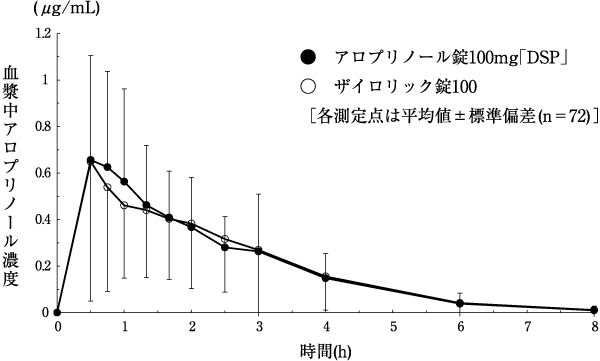 アロプリノール錠100mg「DSP」とザイロリック錠100を、クロスオーバー法によりそれぞれ1錠(アロプリノール 100mg)健康成人男性に空腹時単回経口投与して血漿中アロプリノール濃度を測定し、得られた薬物動態パラメータ(AUC、Cmax)について90%信頼区間法にて統計解析を行った結果、log(0.8)〜log(1.25)の範囲内であり、両剤の生物学的同等性が確認された7)。