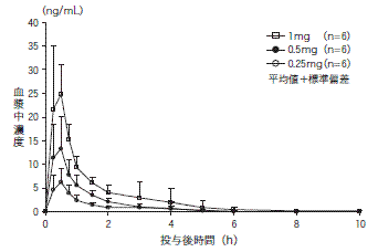健康成人男性に本剤0.25、0.5又は1mgを食直前に単回経口投与したときの血漿中レパグリニドの薬物動態パラメータ及び濃度推移は以下のとおりであった1)。