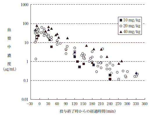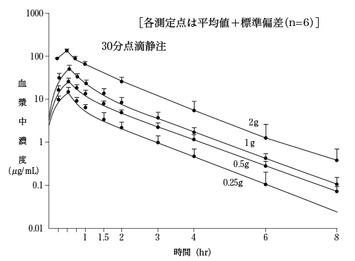 健康成人に30分点滴静注した場合の薬物動態パラメータは次表のとおりであり、血漿中濃度は投与量に依存して推移した3),4)。