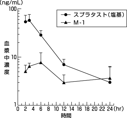 健康成人男子にスプラタストトシル酸塩(カプセル剤)100mgを経口投与(食後30分)し、血漿中スプラタスト(塩基)及びその代謝物を測定した。