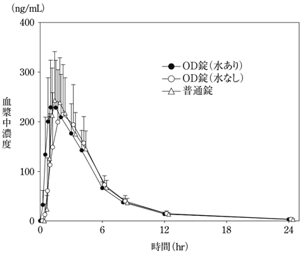 健康成人男性59例にビラノアOD錠20mg(口腔内崩壊錠:以下OD錠)(水あり又は水なしで服用)とビラノア錠(以下、普通錠)20mg(水で服用)を空腹時単回経口投与したとき、いずれにおいても生物学的に同等であることが確認された2)。