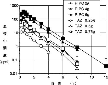 健康成人に本剤(2.25g、4.5g及び6.75g)注4)を、30分点滴静注したときの血漿中濃度の推移及び薬物動態パラメータは図1のとおりであり、タゾバクタム(TAZ)、ピペラシリン(PIPC)の血漿中濃度は用量の増加に伴い上昇した3)。
