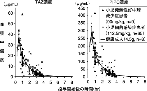 国内の発熱性好中球減少症患者(成人118例、小児12例)を対象に、本剤をそれぞれ4.5g×4回/日(30分以上で点滴静注)、90mg/kg×4回/日(30分以上で点滴静注)で7日間(最長14日間)投与したときの試験成績の概要は次表のとおりであった5)。