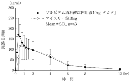 ゾルピデム酒石酸塩内用液10mg「タカタ」とマイスリー錠10mgをクロスオーバー法により、健康成人男子43名にそれぞれ1包又は1錠(ゾルピデム酒石酸塩として10mg)を空腹時に単回経口投与し、投与前、投与後0.17、0.33、0.5、0.75、1、1.25、1.5、2、4、6、8及び12時間に前腕静脈から採血した。HPLCにより測定したゾルピデムの血漿中濃度の推移及びパラメータは次のとおりであり、統計解析にて90%信頼区間を求めた結果、判定パラメータの対数値の平均値の差はlog(0.80)~log(1.25)の範囲にあり、両剤の生物学的同等性が確認された1)。