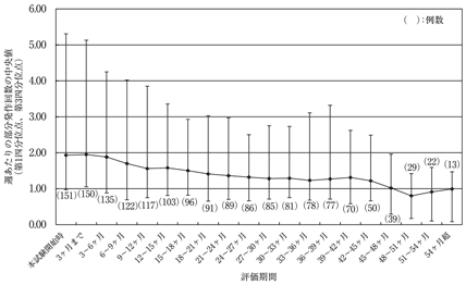 国内第Ⅱ/Ⅲ相試験(成人、併用療法)を完了した患者151例を対象として、レベチラセタム1000~3000mg/日を1日2回に分けて経口投与したときの部分発作回数は以下のとおりであった35),36),37)。本試験に参加した被験者のうち、76例がその後計画された継続試験に移行し本試験を終了した(24~36ヵ月で1例、36~48ヵ月で47例、48ヵ月以降で28例)。