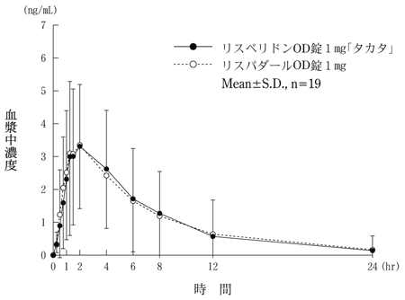 リスペリドンOD錠1mg「タカタ」とリスパダールOD錠1mgをクロスオーバー法により、健康成人男子19名にそれぞれ1錠(リスペリドンとして1mg)を空腹時に単回経口投与し、投与前、投与後0.25、0.5、0.75、1、1.25、1.5、2、4、6、8、12及び24時間に前腕静脈から採血した。LC/MS/MSにより測定したリスペリドンの血漿中濃度の推移及びパラメータは次のとおりであり、統計解析にて90%信頼区間を求めた結果、判定パラメータの対数値の平均値の差はlog0.80~log1.25の範囲にあり、両剤の生物学的同等性が確認された7)。