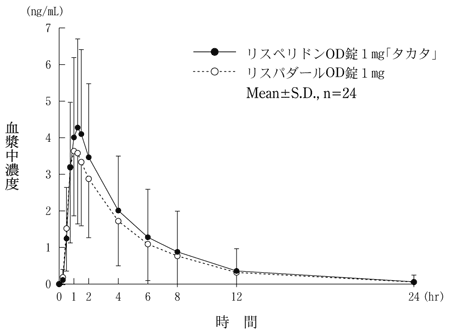 リスペリドンOD錠1mg「タカタ」とリスパダールOD錠1mgをクロスオーバー法により、健康成人男子24名にそれぞれ1錠(リスペリドンとして1mg)を空腹時に単回経口投与し、投与前、投与後0.25、0.5、0.75、1、1.25、1.5、2、4、6、8、12及び24時間に前腕静脈から採血した。LC/MS/MSにより測定したリスペリドンの血漿中濃度の推移及びパラメータは次のとおりであり、統計解析にて90%信頼区間を求めた結果、判定パラメータの対数値の平均値の差はlog0.80~log1.25の範囲にあり、両剤の生物学的同等性が確認された7)。