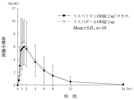 リスペリドンOD錠2mg「タカタ」とリスパダールOD錠2mgをクロスオーバー法により、健康成人男子19名にそれぞれ1錠(リスペリドンとして2mg)を空腹時に単回経口投与し、投与前、投与後0.25、0.5、0.75、1、1.25、1.5、2、4、6、8、12及び24時間に前腕静脈から採血した。LC/MS/MSにより測定したリスペリドンの血漿中濃度の推移及びパラメータは次のとおりであり、統計解析にて90%信頼区間を求めた結果、判定パラメータの対数値の平均値の差はlog0.80~log1.25の範囲にあり、両剤の生物学的同等性が確認された7)。