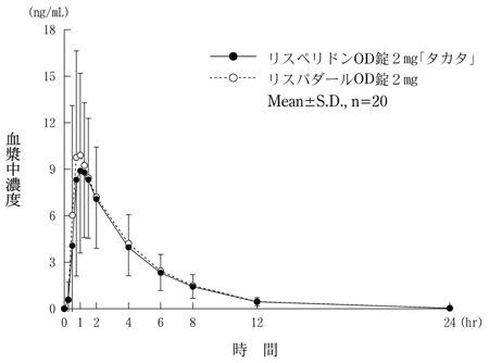 リスペリドンOD錠2mg「タカタ」とリスパダールOD錠2mgをクロスオーバー法により、健康成人男子20名にそれぞれ1錠(リスペリドンとして2mg)を空腹時に単回経口投与し、投与前、投与後0.25、0.5、0.75、1、1.25、1.5、2、4、6、8、12及び24時間に前腕静脈から採血した。LC/MS/MSにより測定したリスペリドンの血漿中濃度の推移及びパラメータは次のとおりであり、統計解析にて90%信頼区間を求めた結果、判定パラメータの対数値の平均値の差はlog0.80~log1.25の範囲にあり、両剤の生物学的同等性が確認された7)。