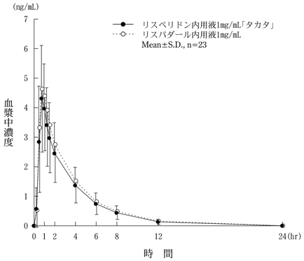 リスペリドン内用液1mg/mL「タカタ」とリスパダール内用液1mg/mLをクロスオーバー法により、健康成人男子23名にそれぞれ1mL(リスペリドンとして1mg)を空腹時に単回経口投与し、投与前、投与後0.25、0.5、0.75、1、1.25、1.5、2、4、6、8、12及び24時間に前腕静脈から採血した。LC/MS/MSにより測定したリスペリドンの血漿中濃度の推移及びパラメータは次のとおりであり、統計解析にて90%信頼区間を求めた結果、判定パラメータの対数値の平均値の差はlog0.8~log1.25の範囲にあり、両剤の生物学的同等性が確認された8)。