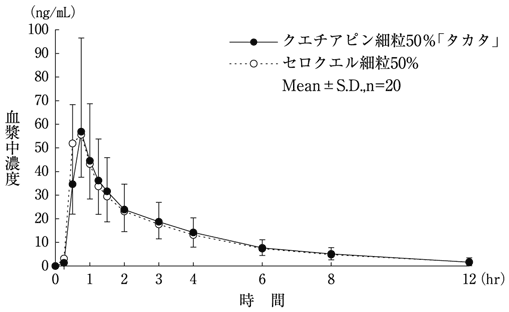 クエチアピン細粒50%「タカタ」とセロクエル細粒50%をクロスオーバー法により、健康成人男子20名にそれぞれ50mg(クエチアピンとして25mg)を空腹時に単回経口投与し、投与前、投与後0.25、0.5、0.75、1、1.25、1.5、2、3、4、6、8及び12時間に前腕静脈から採血した。LC/MS/MSにより測定したクエチアピンの血漿中濃度の推移及びパラメータは次のとおりであり、統計的評価を行った結果、AUCtは対数値の平均値の差の90%信頼区間がlog(0.80)~log(1.25)の範囲にあり、Cmaxは対数値の平均値の差がlog(0.90)~log(1.11)で、かつ、溶出試験で規定する全ての条件で溶出挙動が類似していることから、両剤の生物学的同等性が確認された4)。