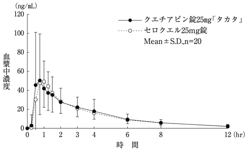 クエチアピン錠25mg「タカタ」とセロクエル25mg錠をクロスオーバー法により、健康成人男子20名にそれぞれ1錠(クエチアピンとして25mg)を空腹時に単回経口投与し、投与前、投与後0.25、0.5、0.75、1、1.25、1.5、2、3、4、6、8及び12時間に前腕静脈から採血した。LC/MS/MSにより測定したクエチアピンの血漿中濃度の推移及びパラメータは次のとおりであり、統計的評価を行った結果、AUCtは対数値の平均値の差の90%信頼区間がlog(0.80)~log(1.25)の範囲にあり、Cmaxは対数値の平均値の差がlog(0.90)~log(1.11)で、かつ、溶出試験で規定する全ての条件で溶出挙動が類似していることから、両剤の生物学的同等性が確認された5)。