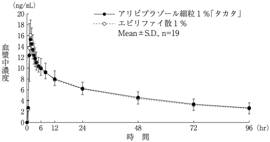 アリピプラゾール錠3mg「タカタ」とエビリファイ錠3mgをクロスオーバー法により、健康成人男子19名にそれぞれ1錠(アリピプラゾールとして3mg)を空腹時に単回経口投与し、投与前、投与後0.5、1、1.5、2、2.5、3、3.5、4、5、6、8、12、24、48、72及び96時間に前腕静脈から採血した。LC/MSにより測定したアリピプラゾールの平均血漿中濃度の推移及びパラメータは次のとおりであり、統計解析にて90%信頼区間を求めた結果、評価パラメータの対数値の平均値の差はlog(0.80)~log(1.25)の範囲にあり、両剤の生物学的同等性が確認された7)。