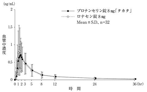 ブロナンセリン錠8mg「タカタ」とロナセン錠8mgを、クロスオーバー法によりそれぞれ1錠(ブロナンセリンとして8mg)、健康成人男性に絶食単回経口投与して血漿中未変化体濃度を測定し、得られた薬物動態パラメータ(AUC、Cmax)について統計解析を行った。その結果、AUCについては対数値の平均値の差の90%信頼区間がlog(0.80)~log(1.25)の範囲にあり、Cmaxについては対数値の平均値の差がlog(0.90)~log(1.11)の範囲にあり、かつ、後発医薬品の生物学的同等性試験ガイドラインで規定する溶出試験の全ての条件で溶出挙動が類似していたことから両剤の生物学的同等性が確認された2)。