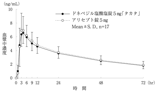 3) 社内資料:生物学的同等性試験(ドネペジル塩酸塩錠5mg「タカタ」)