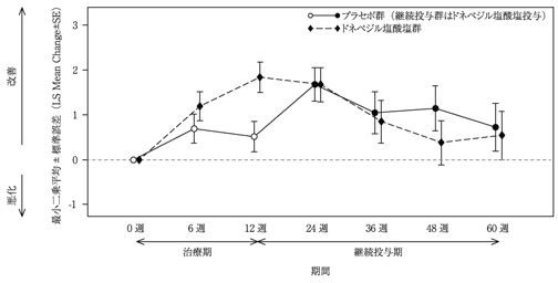 143例が治療期を完了し、そのうち139例が継続投与期に移行し、105例が継続投与期を完了した。副次評価項目である各評価時期(治療期及び継続投与期)におけるMMSEのベースラインからの変化量の推移は下図のとおりであった。