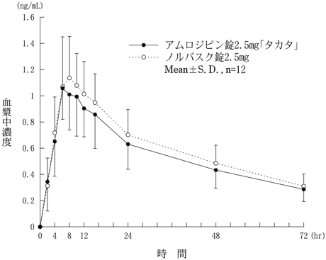 アムロジピン錠2.5mg「タカタ」とノルバスク錠2.5mgをクロスオーバー法により、健康成人男子12名にそれぞれ1錠(アムロジピンとして2.5mg)を空腹時に単回経口投与し、投与前、投与後2、4、6、8、10、12、15、24、48及び72時間に前腕静脈から採血した。LC/MS/MSにより測定したアムロジピンの血漿中濃度の推移及びパラメータは次のとおりであり、統計解析にて90%信頼区間を求めた結果、判定パラメータの対数値の平均値の差はlog(0.80)~log(1.25)の範囲にあり、両剤の生物学的同等性が確認された8)。