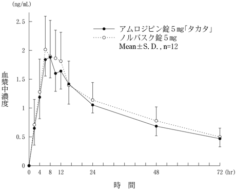 アムロジピン錠5mg「タカタ」とノルバスク錠5mgをクロスオーバー法により、健康成人男子12名にそれぞれ1錠(アムロジピンとして5mg)を空腹時に単回経口投与し、投与前、投与後2、4、6、8、10、12、15、24、48及び72時間に前腕静脈から採血した。LC/MS/MSにより測定したアムロジピンの血漿中濃度の推移及びパラメータは次のとおりであり、統計解析にて90%信頼区間を求めた結果、判定パラメータの対数値の平均値の差はlog(0.80)~log(1.25)の範囲にあり、両剤の生物学的同等性が確認された8)。