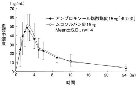 アンブロキソール塩酸塩錠15mg「タカタ」とムコソルバン錠15mgをクロスオーバー法により、健康成人男子14名にアンブロキソール塩酸塩錠15mg「タカタ」2錠(アンブロキソール塩酸塩として30mg)を空腹時に単回経口投与し、投与前、投与後1、1.5、2、2.5、3、4、5、6、9、12及び24時間に前腕静脈から採血した。液体クロマトグラフィーにより測定したアンブロキソール塩酸塩の血漿中濃度の推移及びパラメータは次のとおりであり、AUC及びCmaxについて統計的評価を行った結果、両剤の生物学的同等性が確認された1)。