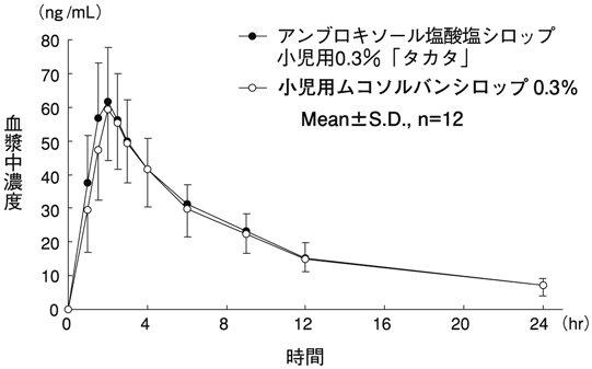 アンブロキソール塩酸塩シロップ小児用0.3%「タカタ」と小児用ムコソルバンシロップ0.3%をクロスオーバー法により、健康成人男子12名にそれぞれ10mL(アンブロキソール塩酸塩として30mg)を空腹時に単回経口投与し、投与前、投与後1、1.5、2、2.5、3、4、6、9、12及び24時間に前腕静脈から採血した。液体クロマトグラフィーにより測定したアンブロキソール塩酸塩の血漿中濃度の推移及びパラメータは次のとおりであり、AUC及びCmaxについて統計的評価を行った結果、両剤の生物学的同等性が確認された1)。