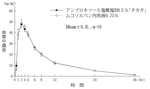 アンブロキソール塩酸塩DS3%「タカタ」とムコソルバン内用液0.75%をクロスオーバー法により、健康成人男子16名にそれぞれアンブロキソール塩酸塩として30mgを空腹時に単回経口投与し、投与前、投与後0.5、1、2、3、4、6、8、12、24及び36時間に前腕静脈から採血した。液体クロマトグラフィーにより測定したアンブロキソール塩酸塩の血漿中濃度の推移及びパラメータは次のとおりであり、AUC及びCmaxについて統計的評価を行った結果、両剤の生物学的同等性が確認された1)。