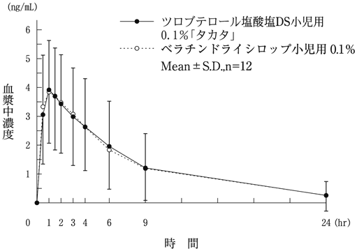 ツロブテロール塩酸塩DS小児用0.1%「タカタ」とベラチンドライシロップ小児用0.1%をクロスオーバー法により、健康成人男子12名にそれぞれ2g(ツロブテロール塩酸塩として2mg)を空腹時に単回経口投与し、投与前、投与後0.5、1、1.5、2、3、4、6、9及び24時間に採血した。液体クロマトグラフィーにより測定したツロブテロールの血漿中濃度の推移及びパラメータは次のとおりであり、AUC及びCmaxについて統計的評価を行った結果、両剤の生物学的同等性が確認された1)。