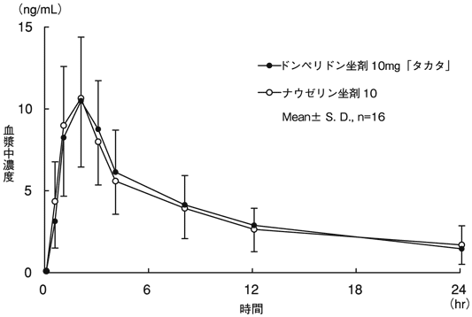ドンペリドン坐剤10mg「タカタ」とナウゼリン坐剤10をクロスオーバー法により、健康成人男子16名にそれぞれ1個(ドンペリドンとして10mg)を絶食時単回直腸内投与し、投与前、投与後0.5、1、2、3、4、8、12及び24時間に前腕静脈から採血した。液体クロマトグラフィーにより測定したドンペリドンの血漿中濃度の推移及びパラメータは次のとおりであり、AUC及びCmaxについて統計的評価を行った結果、両剤の生物学的同等性が確認された1)。