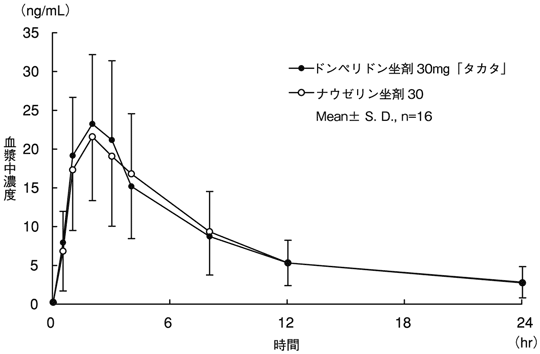 ドンペリドン坐剤30mg「タカタ」とナウゼリン坐剤30をクロスオーバー法により、健康成人男子16名にそれぞれ1個(ドンペリドンとして30mg)を絶食時単回直腸内投与し、投与前、投与後0.5、1、2、3、4、8、12及び24時間に前腕静脈から採血した。液体クロマトグラフィーにより測定したドンペリドンの血漿中濃度の推移及びパラメータは次のとおりであり、AUC及びCmaxについて統計的評価を行った結果、両剤の生物学的同等性が確認された2)。