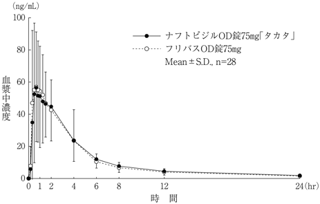 ナフトピジルOD錠75mg「タカタ」とフリバスOD錠75mgをクロスオーバー法により、健康成人男子28名にそれぞれ1錠(ナフトピジルとして75mg)を空腹時に水で単回経口投与し、投与前、投与後0.17、0.33、0.5、0.67、0.83、1、1.25、1.5、2、4、6、8、12及び24時間に前腕静脈から採血した。LC/MS/MSにより測定したナフトピジルの血漿中濃度の推移及びパラメータは次のとおりであり、統計解析にて90%信頼区間を求めた結果、判定パラメータの対数値の平均値の差はlog(0.80)~log(1.25)の範囲にあり、両剤の生物学的同等性が確認された2)。