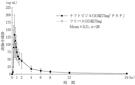 ナフトピジルOD錠75mg「タカタ」とフリバスOD錠75mgをクロスオーバー法により、健康成人男子28名にそれぞれ1錠(ナフトピジルとして75mg)を空腹時に水なしで単回経口投与し、投与前、投与後0.17、0.33、0.5、0.67、0.83、1、1.25、1.5、2、4、6、8、12及び24時間に前腕静脈から採血した。LC/MS/MSにより測定したナフトピジルの血漿中濃度の推移及びパラメータは次のとおりであり、統計解析にて90%信頼区間を求めた結果、判定パラメータの対数値の平均値の差はlog(0.80)~log(1.25)の範囲にあり、両剤の生物学的同等性が確認された2)。