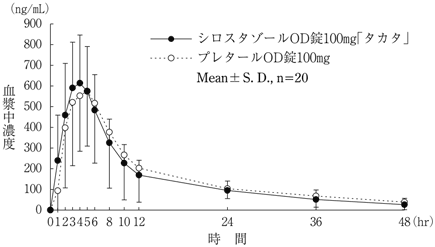 シロスタゾールOD錠100mg「タカタ」とプレタールOD錠100mgをクロスオーバー法により、健康成人男子20名にそれぞれ1錠(シロスタゾールとして100mg)を空腹時に単回経口投与し、投与前、投与後1、2、3、4、5、6、8、10、12、24、36及び48時間に前腕静脈から採血した。LC/MSにより測定したシロスタゾールの血漿中濃度の推移及びパラメータは次のとおりであり、統計解析にて90%信頼区間を求めた結果、判定パラメータの対数値の平均値の差はlog(0.80)~log(1.25)の範囲にあり、両剤の生物学的同等性が確認された10)。