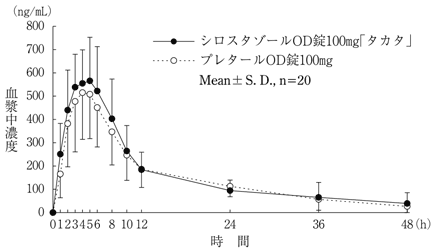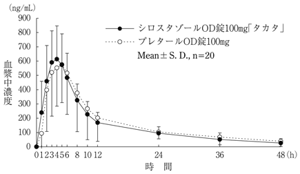 シロスタゾールOD錠100mg「タカタ」とプレタールOD錠100mgをクロスオーバー法により、健康成人男子20名にそれぞれ1錠(シロスタゾールとして100mg)を空腹時に単回経口投与し、投与前、投与後1、2、3、4、5、6、8、10、12、24、36及び48時間に前腕静脈から採血した。LC/MSにより測定したシロスタゾールの血漿中濃度の推移及びパラメータは次のとおりであり、統計解析にて90%信頼区間を求めた結果、判定パラメータの対数値の平均値の差はlog(0.80)~log(1.25)の範囲にあり、両剤の生物学的同等性が確認された10)。