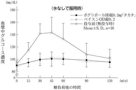 ボグリボースOD錠0.2mg「タカタ」とベイスンOD錠0.2をクロスオーバー法により、健康成人男子16名にそれぞれ1錠(ボグリボースとして0.2mg)を1日3回毎食直前にのべ4日間(9回)連続経口投与した。投与前及び最終投与直後にショ糖負荷(50%溶液、200mL)し、経時的に測定したグルコースの血漿中濃度の推移及びパラメータは次のとおりであった。得られたパラメータ(ΔAUC、ΔCmax)について統計解析を行った結果、両剤の生物学的同等性が確認された16)。[ΔAUC:投与前後の血漿中グルコース濃度-時間曲線下面積の差、ΔCmax:投与前後の最高血漿中グルコース濃度の差]