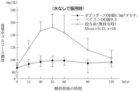 ボグリボースOD錠0.3mg「タカタ」とベイスンOD錠0.3をクロスオーバー法により、健康成人男子16名にそれぞれ1錠(ボグリボースとして0.3mg)を1日3回毎食直前にのべ4日間(9回)連続経口投与した。投与前及び最終投与直後にショ糖負荷(50%溶液、200mL)し、経時的に測定したグルコースの血漿中濃度の推移及びパラメータは次のとおりであった。得られたパラメータ(ΔAUC、ΔCmax)について統計解析を行った結果、両剤の生物学的同等性が確認された17)。[ΔAUC:投与前後の血漿中グルコース濃度-時間曲線下面積の差、ΔCmax:投与前後の最高血漿中グルコース濃度の差]