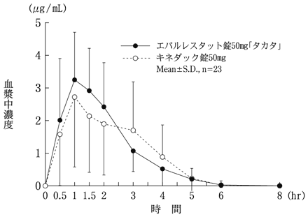 エパルレスタット錠50mg「タカタ」とキネダック錠50mgをクロスオーバー法により、健康成人男子23名にそれぞれ1錠(エパルレスタットとして50mg)を空腹時に単回経口投与し、投与前、投与後0.5、1、1.5、2、3、4、5、6及び8時間に前腕静脈から採血した。液体クロマトグラフィーにより測定したエパルレスタットの血漿中濃度の推移及びパラメータは次のとおりであり、統計解析にて90%信頼区間を求めた結果、判定パラメータの対数値の平均値の差はlog0.8~log1.25の範囲にあり、両剤の生物学的同等性が確認された3)。