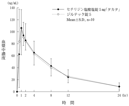 セチリジン塩酸塩錠5mg「タカタ」とジルテック錠5をクロスオーバー法により、健康成人男子10名にそれぞれ1錠(セチリジン塩酸塩として5mg)を空腹時に単回経口投与し、投与前、投与後0.5、1、1.5、2、4、8、12及び24時間に前腕静脈から採血した。LC/MS/MSにより測定したセチリジンの血漿中濃度の推移及びパラメータは次のとおりであり、統計解析にて90%信頼区間を求めた結果、判定パラメータの対数値の平均値の差はlog(0.8)~log(1.25) の範囲にあり、両剤の生物学的同等性が確認された1)。
