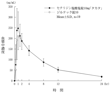セチリジン塩酸塩錠10mg「タカタ」とジルテック錠10をクロスオーバー法により、健康成人男子19名にそれぞれ1錠(セチリジン塩酸塩として10mg)を空腹時に単回経口投与し、投与前、投与後0.33、0.67、1、1.5、2、4、8、12及び24時間に前腕静脈から採血した。LC/MS/MSにより測定したセチリジンの血漿中濃度の推移及びパラメータは次のとおりであり、統計解析にて90%信頼区間を求めた結果、判定パラメータの対数値の平均値の差はlog(0.8) ~log(1.25)の範囲にあり、両剤の生物学的同等性が確認された2)。