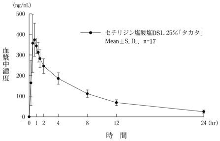 「経口固形製剤の処方変更の生物学的同等性試験ガイドライン」に基づき、セチリジン塩酸塩DS1.25%「タカタ」とジルテックドライシロップ1.25%を対象とした生物学的同等性試験により同等性が確認されている旧処方製剤をクロスオーバー法により、健康成人男子17名にそれぞれ0.8g(セチリジン塩酸塩として10mg)を空腹時に単回経口投与し、投与前、投与後0.25、0.5、0.75、1、1.25、1.5、2、4、8、12及び24時間に前腕静脈から採血した。LC/MSにより測定したセチリジンの血漿中濃度の推移及びパラメータは次のとおりであり、両剤は生物学的に同等であると判断された1)。