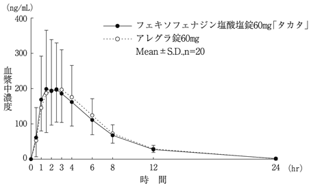 フェキソフェナジン塩酸塩錠60mg「タカタ」とアレグラ錠60mgをクロスオーバー法により、健康成人男子20名にそれぞれ1錠(フェキソフェナジン塩酸塩として60mg)を空腹時に単回経口投与し、投与前、投与後0.5、1、1.5、2、2.5、3、4、6、8、12及び24時間に前腕静脈から採血した。LC/MSにより測定したフェキソフェナジンの血漿中濃度の推移及びパラメータは次のとおりであり、統計解析にて90%信頼区間を求めた結果、判定パラメータの対数値の平均値の差はlog(0.80)~log(1.25)の範囲にあり、両剤の生物学的同等性が確認された1)。