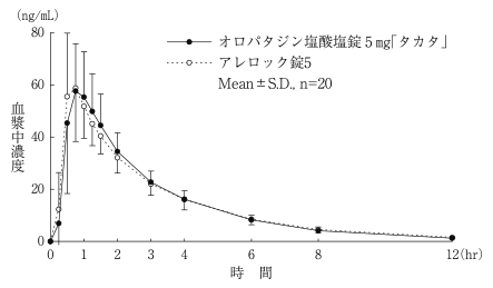 オロパタジン塩酸塩錠5mg「タカタ」とアレロック錠5をクロスオーバー法により、健康成人男子20名にそれぞれ1錠(オロパタジン塩酸塩として5mg)を空腹時に単回経口投与し、投与前、投与後0.25、0.5、0.75、1、1.25、1.5、2、3、4、6、8及び12時間に前腕静脈から採血した。LC/MSにより測定したオロパタジンの血漿中濃度の推移及びパラメータは次のとおりであり、統計解析にて90%信頼区間を求めた結果、判定パラメータの対数値の平均値の差はlog(0.80)~log(1.25)の範囲にあり、両剤の生物学的同等性が確認された1)。