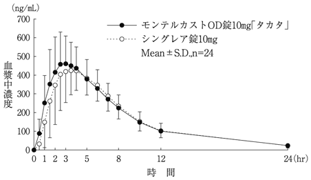 モンテルカストOD錠10mg「タカタ」とシングレア錠10mgをクロスオーバー法により、健康成人男子24名にそれぞれ1錠(モンテルカストとして10mg)を空腹時に水で単回経口投与し、投与前、投与後0.5、1、1.5、2、2.5、3、3.5、4、5、6、7、8、10、12及び24時間に前腕静脈から採血した。LC/MSにより測定したモンテルカストの血漿中濃度の推移及びパラメータは次のとおりであり、統計解析にて90%信頼区間を求めた結果、判定パラメータの対数値の平均値の差はlog(0.80)~log(1.25)の範囲にあり、両剤の生物学的同等性が確認された5)。