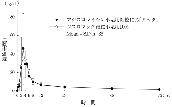 アジスロマイシン小児用細粒10%「タカタ」 とジスロマック細粒小児用10%をクロスオーバー法により、健康成人男子38名にそれぞれ1g[アジスロマイシンとして100mg(力価)]を空腹時に単回経口投与し、投与前、投与後0.5、1、2、3、4、5、6、8、12、24、48及び72時間に前腕静脈から採血した。LC/MS/MSにより測定したアジスロマイシンの血漿中濃度の推移及びパラメータは次のとおりであり、統計解析にて90%信頼区間を求めた結果、判定パラメータの対数値の平均値の差はlog0.8~log1.25の範囲にあり、両剤の生物学的同等性が確認された19)。