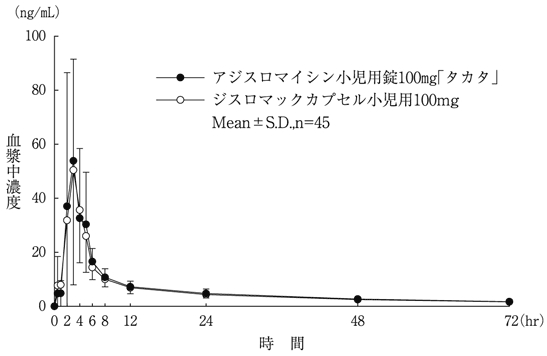 アジスロマイシン小児用錠100mg「タカタ」とジスロマックカプセル小児用100mgをクロスオーバー法により、健康成人男子45名にそれぞれアジスロマイシン小児用錠100mg「タカタ」1錠、ジスロマックカプセル小児用100mg1カプセル[アジスロマイシンとして100mg(力価)]を空腹時に単回経口投与し、投与前、投与後0.5、1、2、3、4、5、6、8、12、24、48及び72時間に前腕静脈から採血した。LC/MS/MSにより測定したアジスロマイシンの血漿中濃度の推移及びパラメータは次のとおりであり、統計解析にて90%信頼区間を求めた結果、判定パラメータの対数値の平均値の差はlog0.8~log1.25の範囲にあり、両剤の生物学的同等性が確認された19)。