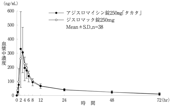 アジスロマイシン錠250mg「タカタ」とジスロマック錠250mgをクロスオーバー法により、健康成人男子38名にそれぞれ2錠[アジスロマイシンとして500mg(力価)]を空腹時に単回経口投与し、投与前、投与後0.5、1、2、3、4、5、6、8、12、24、48及び72時間に前腕静脈から採血した。LC/MS/MSにより測定したアジスロマイシンの血漿中濃度の推移及びパラメータは次のとおりであり、統計解析にて90%信頼区間を求めた結果、判定パラメータの対数値の平均値の差はlog0.8~log1.25の範囲にあり、両剤の生物学的同等性が確認された19)。