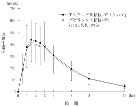 アシクロビル顆粒40%「タカタ」とゾビラックス顆粒40%をクロスオーバー法により、健康成人男子24名にそれぞれ0.5g(アシクロビルとして200mg)を空腹時に単回経口投与し、投与前、投与後0.5、1、1.5、2、2.5、3、4、6、8及び12時間に前腕静脈から採血した。LC/MS/MSにより測定したアシクロビルの血漿中濃度の推移及びパラメータは次のとおりであり、統計解析にて90%信頼区間を求めた結果、判定パラメータの対数値の平均値の差はlog0.8~log1.25の範囲にあり、両剤の生物学的同等性が確認された8)。