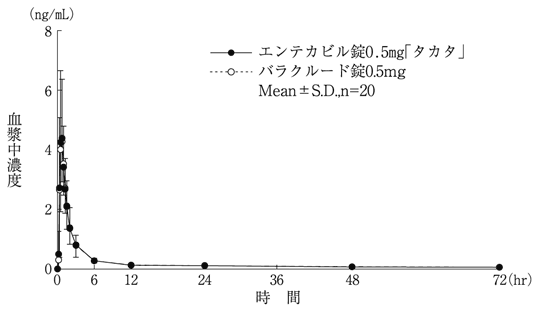 エンテカビル錠0.5mg「タカタ」とバラクルード錠0.5mgをクロスオーバー法により、健康成人男子20名にそれぞれ1錠(エンテカビルとして0.5mg)を空腹時に単回経口投与し、投与前、投与後0.17、0.33、0.5、0.75、1、1.25、1.5、2、3、6、12、24、48及び72時間に前腕静脈から採血した。LC/MS/MSにより測定したエンテカビルの平均血漿中濃度の推移及びパラメータは次のとおりであり、統計解析にて90%信頼区間を求めた結果、評価パラメータの対数値の平均値の差はlog(0.80)~log(1.25)の範囲にあり、両剤の生物学的同等性が確認された1)。