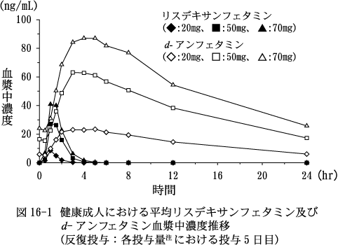 健康成人11例に本剤20mg注1)、50mg及び70mgを漸増法でそれぞれ1日1回空腹時5日間、計15日間反復経口投与したとき、各投与量における投与5日目の血漿中リスデキサンフェタミン及びd-アンフェタミン濃度推移を図16-1に、薬物動態パラメータを表16-1に示す。d-アンフェタミンは投与後3~5時間でCmaxに達し、Cmax及びAUCは用量に比例して増加した。また、反復投与開始後5日以内に定常状態に達した1)。
